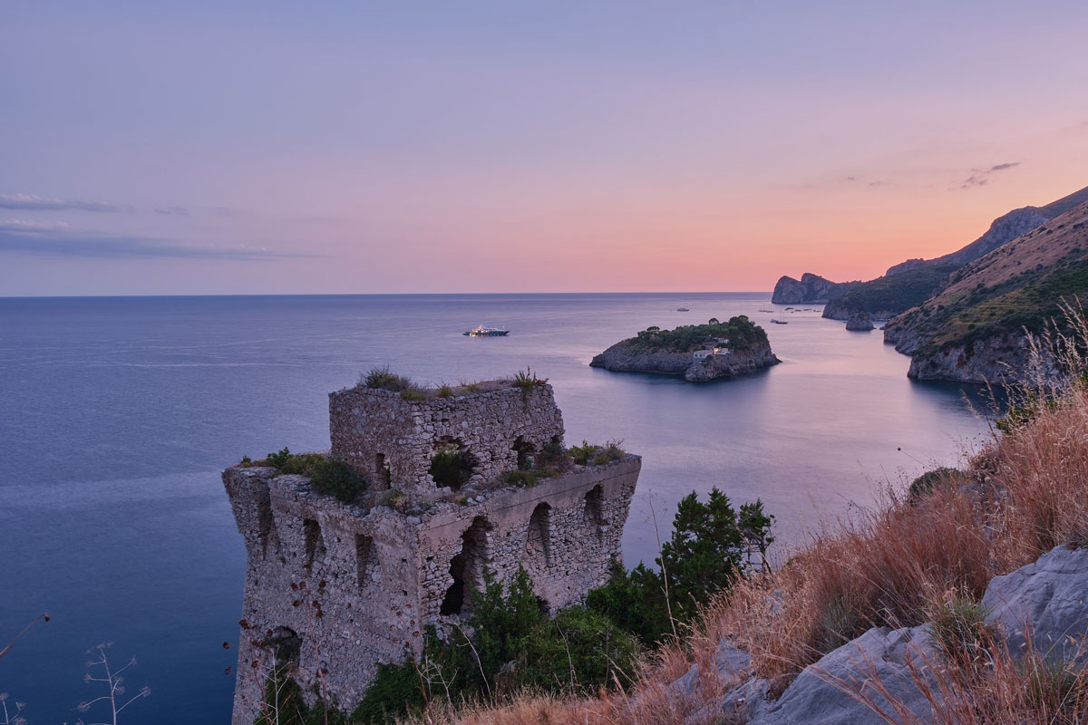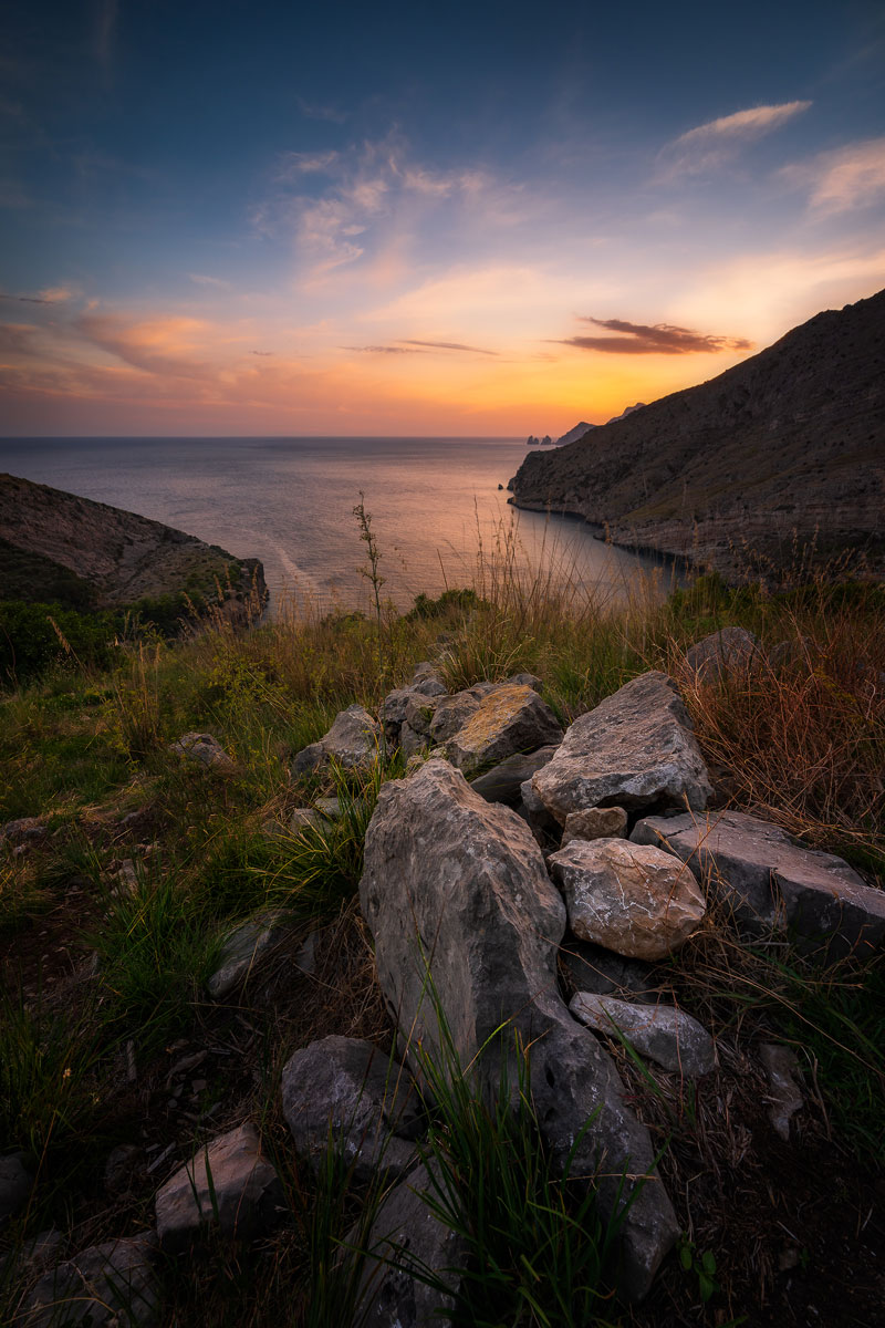 Il tramonto sulla Baia di Ieranto a Massa Lubrense, con i Faraglioni di Capri sullo sfondo è la foto di Simone Mastellone selezionata a rappresentare settembre nel calendario #aboutsorrento2023.
