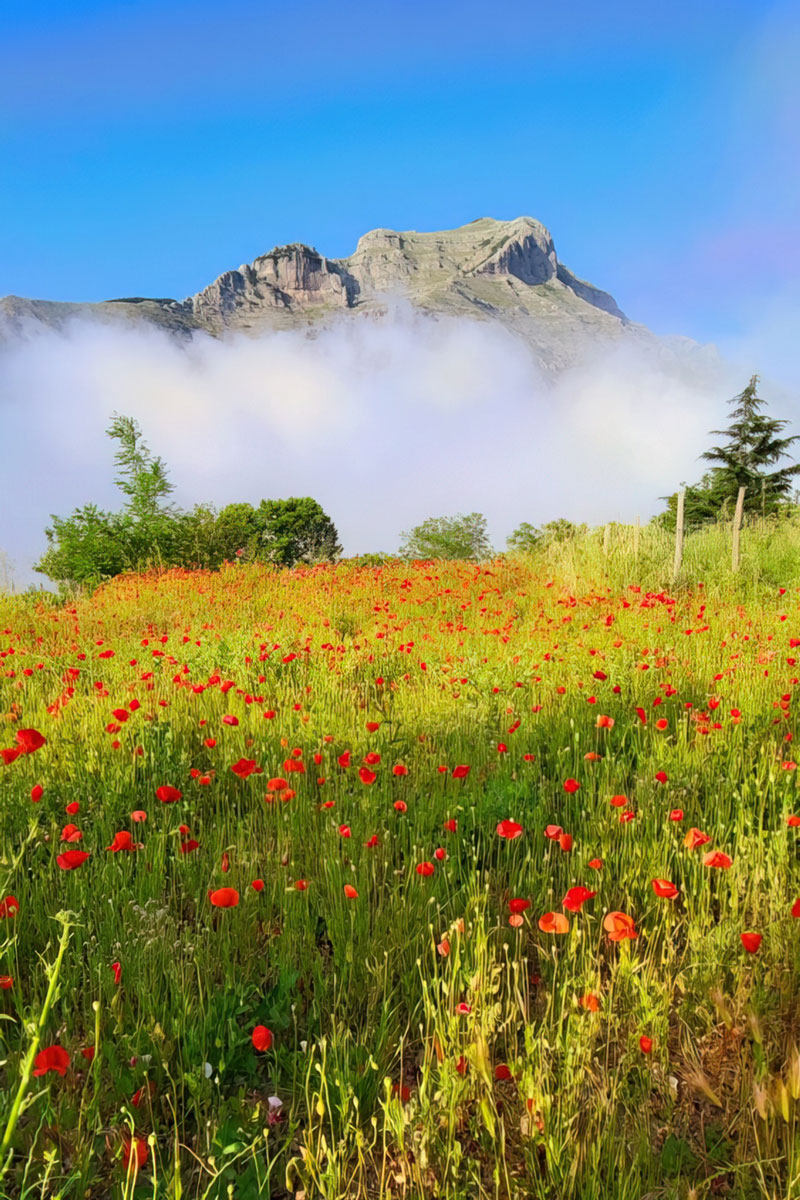 Un prato di papaveri con sullo sfondo una montagna: non sembra un paesaggio della Penisola Sorrentina.