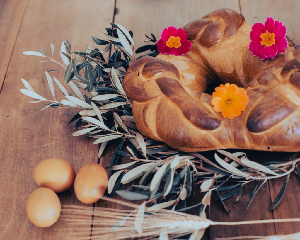 Eggs (sign of rebirth) are placed along the top of the circular bread that have strips of dough crossed over them to symbolize the cross on which Jesus died.