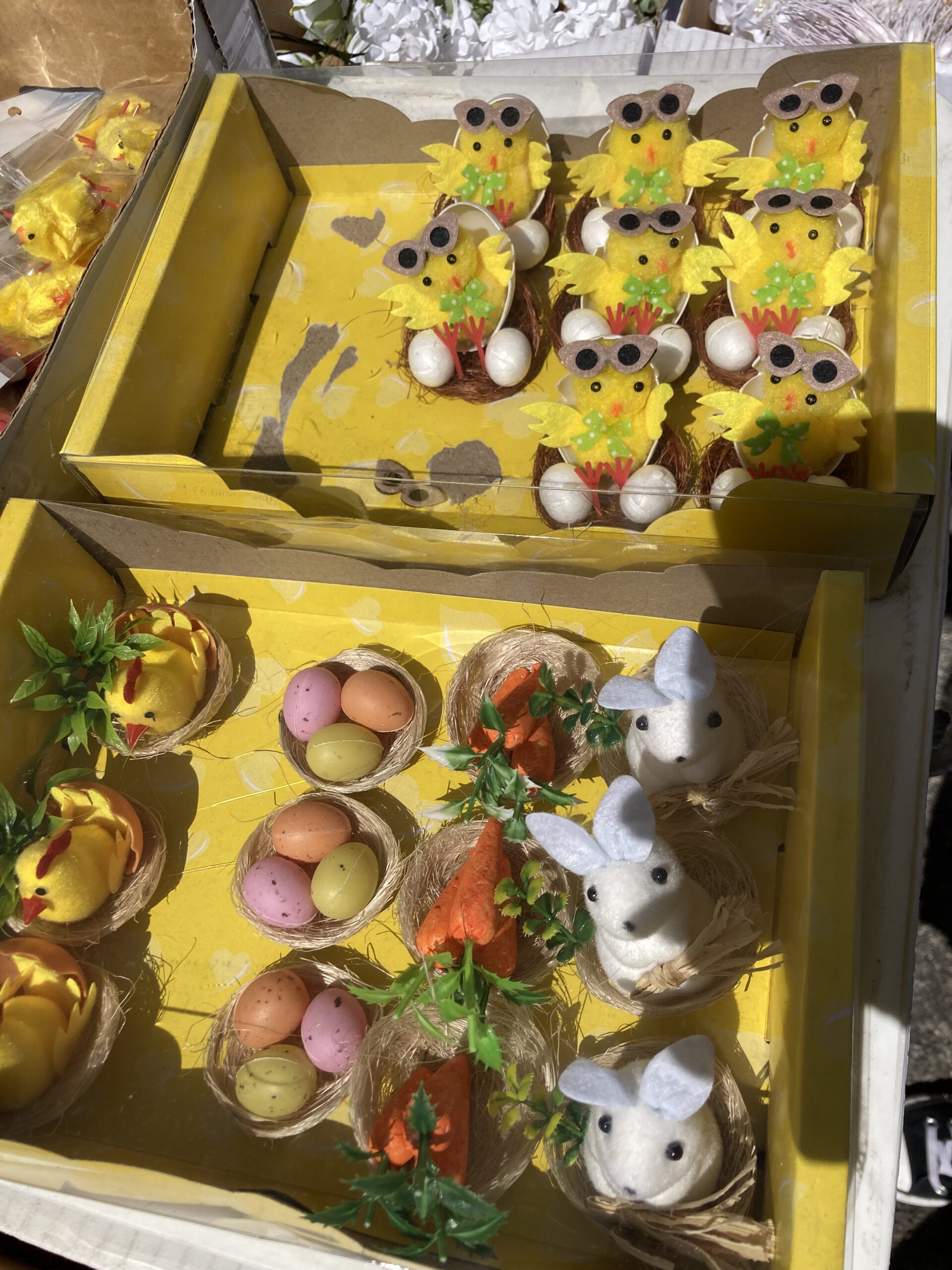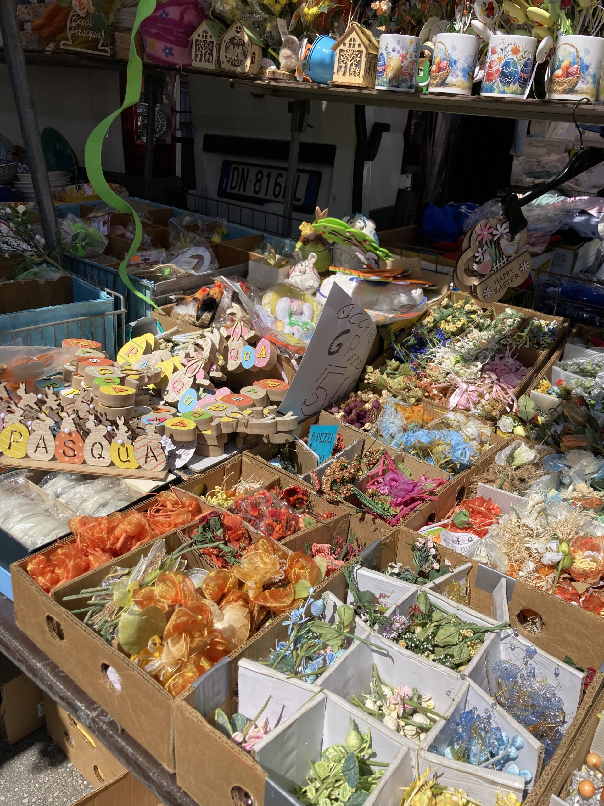 The market was very colorful because alongside a variety of colorful clothing, people were selling Easter decorations: there were a lot of brightly colored fake flowers, chicks, and eggs.