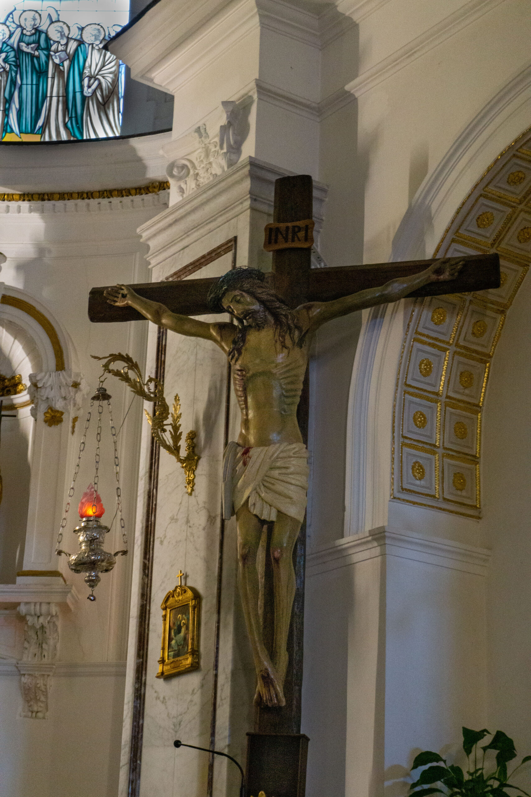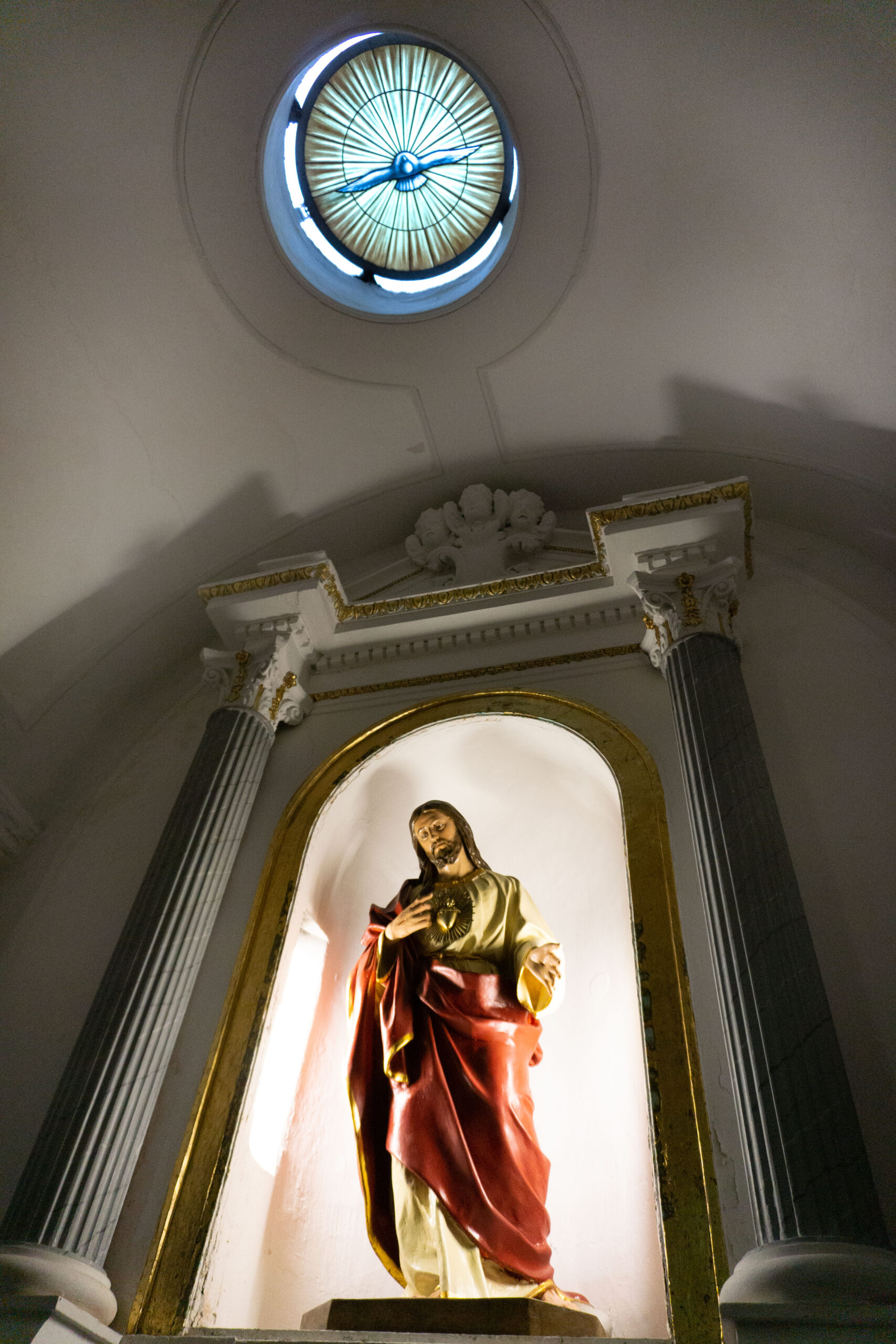 Two upper stained glass windows also shine onto the altar and religious paintings adorn the ceiling and above the altar.