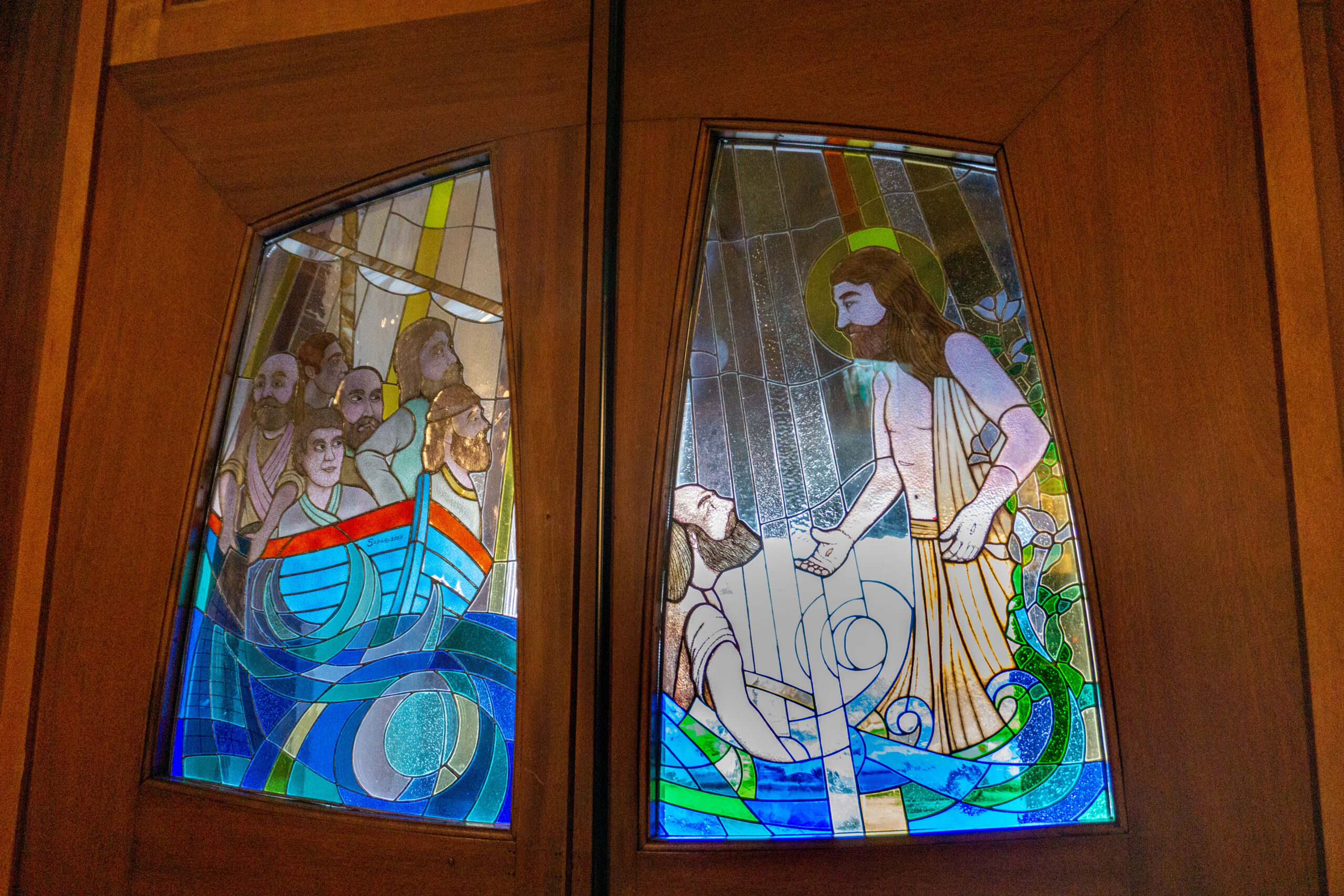 Depicted in the stained glass are the images of Jesus coming before fishermen at sea, showing the intrinsic connection between the church and the local fishermen who founded it.
