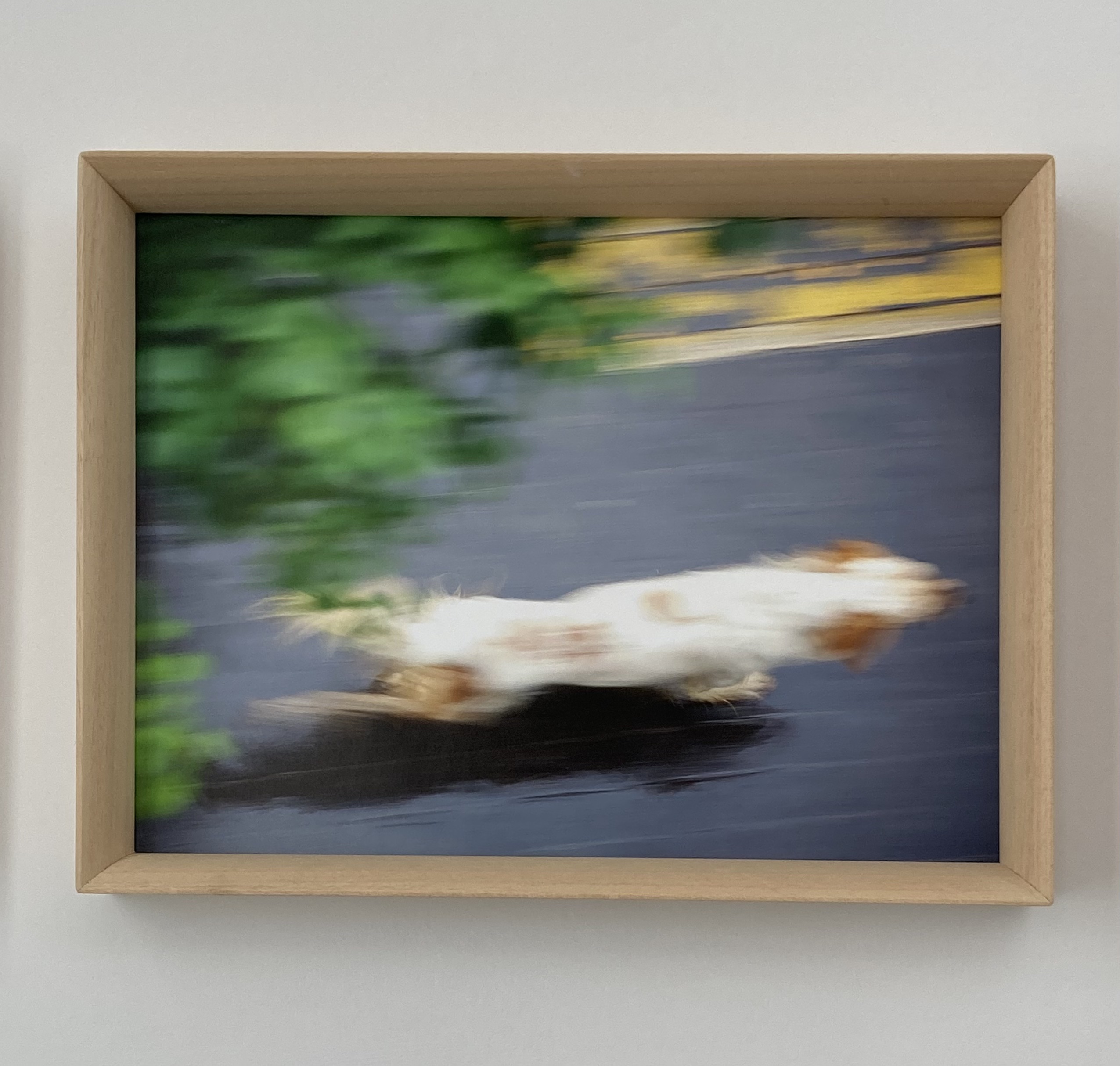 The exhibit lines the walls of one room, and the pictures showcased offer the viewer a look through his window, seeing snapshots of mundane moments with a few unusual moments sprinkled in.