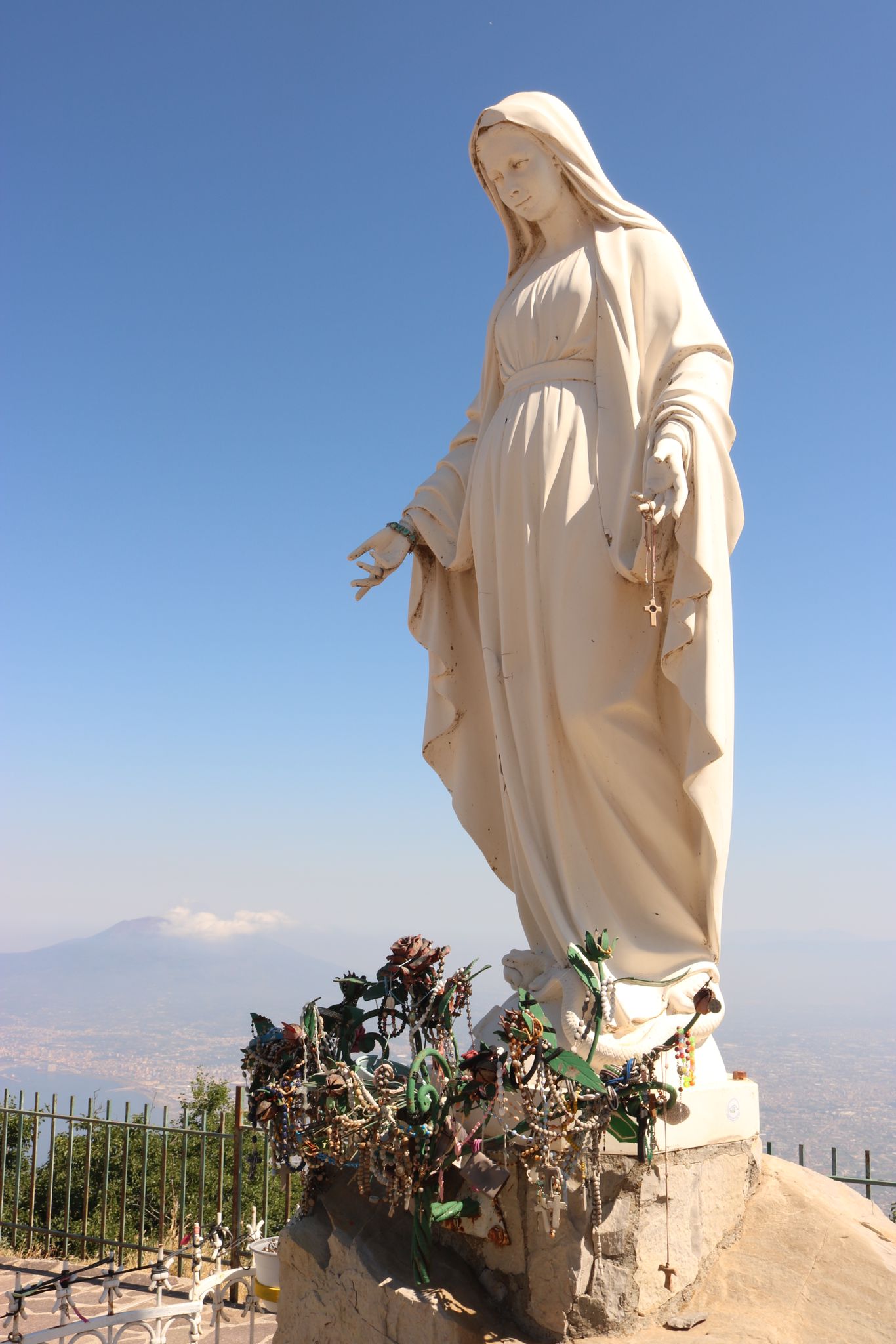 Surrounding her feet and the short fence around her are the memories of past visitors: beaded cross necklaces and other trinkets of religious honor.