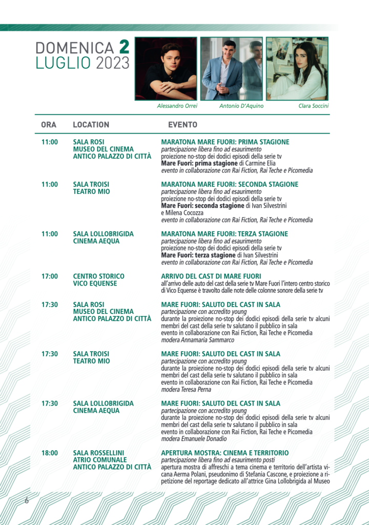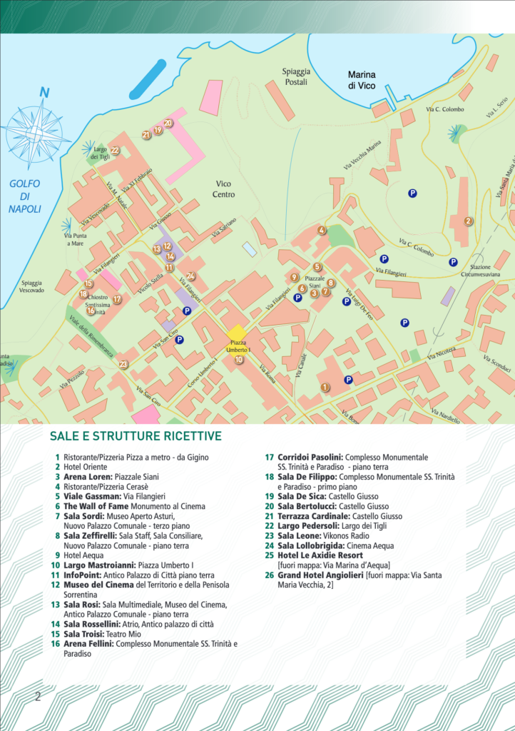 Nei giorni della manifestazione, anche la città di Vico Equense si trasforma in una “Città del Cinema“: piazze e strade diventano Arena Fellini, Arena Loren, Arena Magnani, Largo Mastroianni, Viale Gassman.