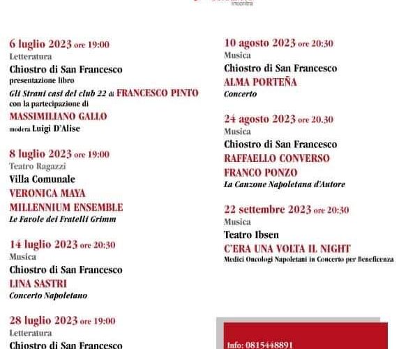 Sette appuntamenti in programma per il format “Sorrento Incontra“, promosso dal Comune di Sorrento e realizzato da InScena, dal 6 Luglio al 22 Settembre 2023.